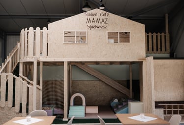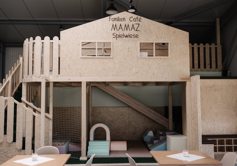 Gemütliches Café trifft auf lebendigen Spiel- und Bewegungsraum für Familien.