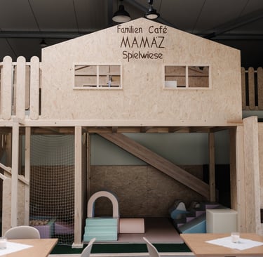 Gemütliches Café trifft auf lebendigen Spielbereich für Kinder.